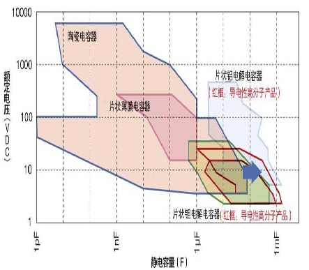 圖1:應(yīng)用范圍不斷擴(kuò)大的片狀獨(dú)石陶瓷電容器以額定電壓為縱軸,以靜電容量為橫軸