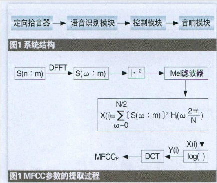 車載語音控制器系統(tǒng)由定向拾音器、語音識別模塊、控制模塊和音響模塊組成。系統(tǒng)的功能是:由拾音器采集駕駛員發(fā)出的語音命令,利用語音識別模塊將拾音器輸出的語音物理聲音信號轉(zhuǎn)變成語音數(shù)字信號,并識別出語音命令對應的漢字或詞語,之后由控制模塊產(chǎn)生與之對應的詞條編碼指令,通過系統(tǒng)I/O口線將控制命令傳達給音響,車載音響接收到控制指令產(chǎn)生動作,響應駕駛員的語音命令,比如快進、快退或音量調(diào)節(jié)等。系統(tǒng)結(jié)構(gòu)及原理框圖如圖1 所示: