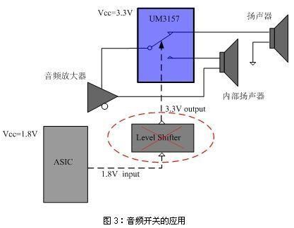此外,英聯(lián)的低ICCT系列模擬開關(guān)具有更低的VIH電平值,可以使用較低的控制電平實(shí)現(xiàn)開關(guān)的高電平切換控制。產(chǎn)品的這種特性大大減少了系統(tǒng)工程師設(shè)計(jì)電路的復(fù)雜性,特別是在供電電源和控制信號(hào)電平不匹配的便攜產(chǎn)品應(yīng)用中可以免除使用電平轉(zhuǎn)換模塊,從而有效降低了成本。以模擬開關(guān)用來切換音頻信號(hào)為例,如圖3所示,可以使用ASIC傳輸過來的1.8V電壓直接來控制UM3157的控制管腳,而不必采用電平轉(zhuǎn)移器也能在實(shí)現(xiàn)開關(guān)切換的同時(shí)達(dá)到很小的漏電流。此外,由于低ICCT模擬開關(guān)不消耗很多功耗(大約1uA),且開關(guān)的導(dǎo)通電阻隨工作電壓的增加而降低,設(shè)計(jì)人員可以使用較高的供電電壓來達(dá)到更低的導(dǎo)通電阻。對(duì)于典型的音頻開關(guān)或USB應(yīng)用,低的導(dǎo)通電阻是非常重要的。