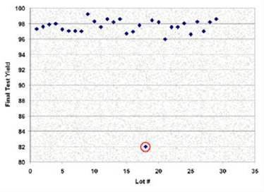 圖4最終測試良率(超負載試驗前)和標(biāo)出不符合統(tǒng)計良率限值的點的示例圖。該點是一個異常值,是要求進一步篩選和分析的風(fēng)險點,也可能會出現(xiàn)不合格品。
