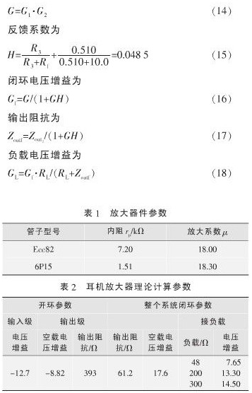 輸入級(jí)放大器件選用Ecc82雙三極管,輸出級(jí)選用6P15,基本參數(shù)如表1所示。為降低輸出阻抗,以便于和阻抗較低的耳機(jī)相匹配,輸出級(jí)SRPP電路采用雙管并聯(lián)的方式工作。放大器的相關(guān)參數(shù)計(jì)算方法如下所示,其中開(kāi)環(huán)電壓增益為: