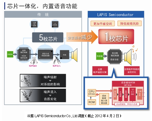 羅姆集團(tuán)旗下的LAPIS Semiconductor Co., Ltd.開發(fā)出一款單芯片的低功耗微控制器“ML610Q380系列”產(chǎn)品,此產(chǎn)品將以往用于家電的控制IGBT的PWM電路和LCD驅(qū)動器等微控制器功能、以及高音質(zhì)、低功耗的語音播放功能集于一枚芯片,這在業(yè)內(nèi)尚屬首家。由于以往用于家電的微控制器沒有語音播放功能,因此想追加語音功能時,語音合成功能和功放需要由不同的芯片組成。而使用本LSI產(chǎn)品,不僅可以芯片一體化,而且可以替換掉以往用于家電的微控制器,輕松實(shí)現(xiàn)語音功能,是需要語音輸出的家用電器和遙控器的最佳選擇。