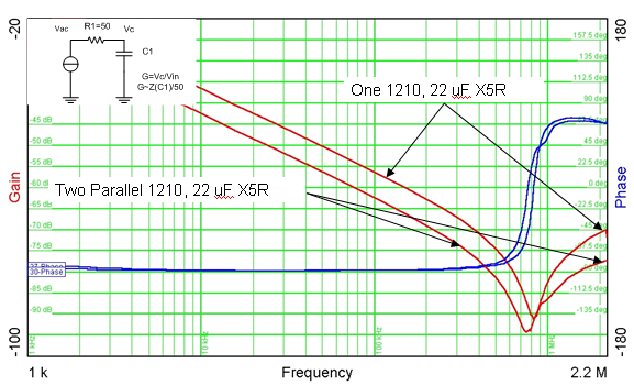 此外,還有一個與旁路電容有關(guān)的串聯(lián)電感,如圖 1 所示。頂部的曲線是貼裝在四層電路板上的一個22 uF、X5R、16V、1210 陶瓷電容的阻抗。正如我們所期望的那樣(100 kHz 以下),阻抗隨著頻率的增加而下降。然而,在800 kHz時有一個串聯(lián)電感,此時電容會變得有電感性。該電感(其可以從電容值和諧振頻率計算得出)為 1.7 nH,其大大高于我們 0.3 nH 的目標值。幸運的是,您可以使用并聯(lián)電容以降低有效的 ESL。圖 1 底部的曲線為兩個并聯(lián)電容的阻抗。有趣的是諧振變得稍微低了一些,這表明有效電感并不是絕對的一半?;谥C振頻率,就兩個并聯(lián)的電容而言,新電感則為 1.0 nH 或ESL 下降 40%,而非下降 50%。這一結(jié)果可以歸結(jié)為兩個原因:互連電感和兩個電容之間的互感。