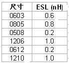 表 1 陶瓷 SMT 電容尺寸會影響寄生電感