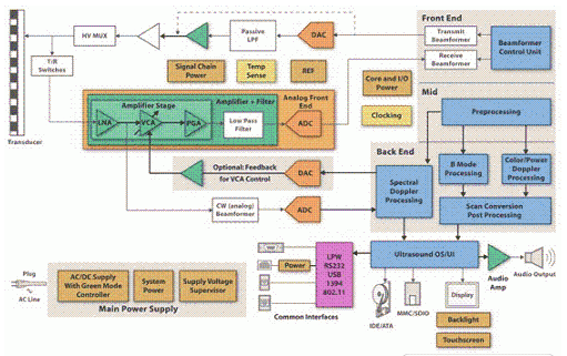 很明顯,在高端便攜式系統(tǒng)之間實(shí)現(xiàn)共享信號(hào)處理單元是非常困難的。但是,在不考慮不同性能要求的情況下,超聲波系統(tǒng)通常擁有相似的接收通道架構(gòu)。