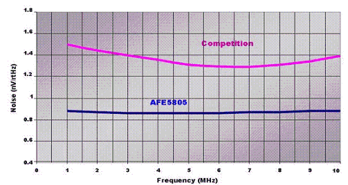 除了功耗以外,AFE 噪聲是超聲波系統(tǒng)設(shè)計(jì)人員需要考慮的第二個(gè)問題。來自超聲波變送器接收信號(hào)的振幅可能會(huì)為介于 10uVPP 到 1VPP [1] 不等。能夠被探測(cè)到的信號(hào)越小,系統(tǒng)的靈敏度就越高。輸入等效電流和輸入等效電壓噪聲都會(huì)影響系統(tǒng)靈敏度。通常,我們?yōu)楦叨说降投说南到y(tǒng)選擇 0.7 nV/rt(Hz)~1.5 nV/rt(Hz) (RTI)的噪聲參數(shù)。經(jīng)在現(xiàn)實(shí)系統(tǒng)中證實(shí),這些噪聲參數(shù)足以產(chǎn)生高質(zhì)量的圖像。