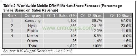 移動(dòng)市場(chǎng)第一季度占總體DRAM營(yíng)業(yè)收入的28.0%。第一季度mDRAM平均銷售價(jià)格(ASP)為1.72美元每GB,仍然高于商品類DRAM,后者價(jià)格是0.52美元每GB。但是,由于商品類DRAM價(jià)格預(yù)計(jì)下半年上漲,而mDRAM價(jià)格總體下降,所以目前移動(dòng)DRAM所擁有的價(jià)格升水今年將逐漸縮小。與此同時(shí),2012年移動(dòng)DRAM營(yíng)業(yè)收入將繼續(xù)增長(zhǎng),其比特出貨量預(yù)計(jì)下半年勁增20%以上。