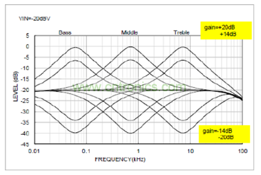 為了實(shí)現(xiàn)音效處理,有必要了解一下音頻DSP均衡器(EQ) 的作用。均衡器具有增益及濾波的電路,增益電路對聲音進(jìn)行提升(Boost) 與削弱(Cut) ;濾波電路可以調(diào)節(jié)到需要的頻率響應(yīng)。普通模擬音效處理IC一般可以提供2頻帶(Bass/Treble) 或者3頻帶(Bass/Middle/Treble),而數(shù)字音效處理IC可以提供多個(gè)頻帶,比如7頻帶,甚至更多。圖5是3頻帶EQ的曲線。