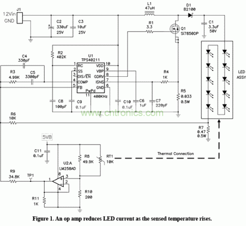 圖1 檢測溫度上升時運算放大器降低LED電流