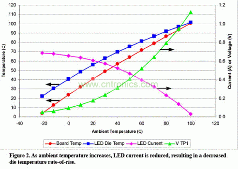 圖2 環(huán)境溫度上升,LED電流降低,從而達到更低的芯片溫升速率。