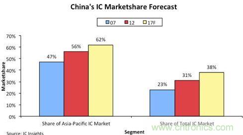 IC Insights表示,中國IC市場規(guī)模將由2014年的1000億美元,在2017年成長至1500億美元;該機構估計,在2017年,中國市場將占據全球晶片市場38%的比例。而在2007年,中國晶片市場營收占據全球晶片市場營收的比例為23%。