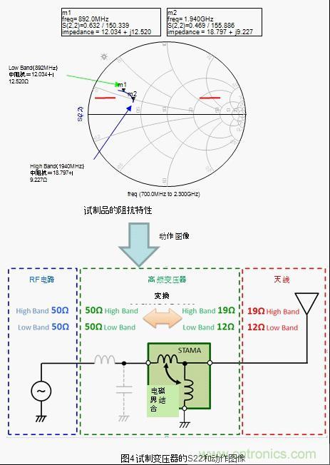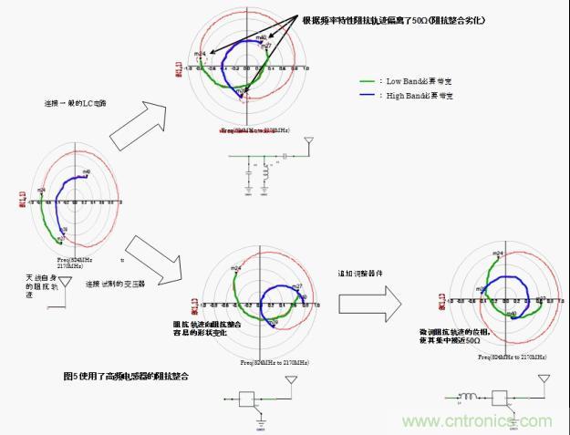 將普通的LC電路跟天線連接,根據(jù)頻率特性的不同在廣帶寬情況下阻抗整合會(huì)變得困難。針對該情況,將本次試制的高頻變壓器跟天線連接,low band和high band都轉(zhuǎn)換成了最合適的阻抗。也就是說,工匠圖上的阻抗軌跡有可能變化成阻抗整合容易的形狀。之后通過外部的調(diào)節(jié)元件將阻抗軌跡的相位進(jìn)行微調(diào),有可能非常容易的就集中在50Ω附近了。(圖5)