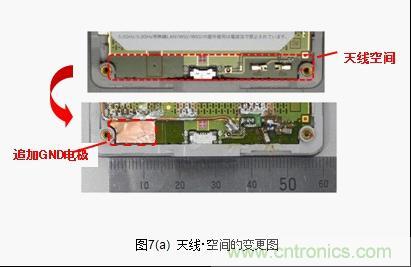 接下來將針對天線小型化的有效性進(jìn)行檢測。一般來說天線具有改善接地距離的特性。但是,天線占據(jù)空間(排除了GND領(lǐng)域)很大的話天線以外的 元器件安裝空間就會(huì)受壓迫。天線小型化和縮小天線空間迫在眉睫。當(dāng)天線空間的一部分被GND占據(jù),對這時(shí)候的天線特性的變化進(jìn)行評價(jià)。天線空間的寬度為52mm,其中13mm被GND占據(jù),low band的特性劣化,變成了跟LC電路等同的Total Efficiency(圖7(b))。這就意味著實(shí)際上天線空間的面積可減少25%。