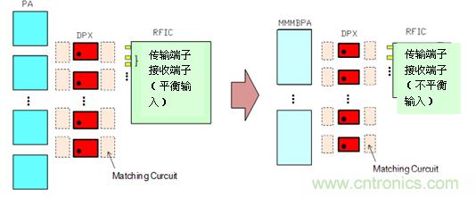 移動終端的前端部分搭載的電子元器件隨著通信功能的混載和搭載頻帶數(shù)量的增加,正在日漸小型化。在構成無線通信設備的同時,RF收發(fā)器IC(RFIC;射頻集成電路)是必備的元器件。RFIC具有變化電波頻率、調節(jié)和調整信號功能。RFIC的接收端輸入端子的趨勢是由平衡輸入轉化成不平衡輸入,通過實現(xiàn)不平衡輸入的信號處理來達到削減RFIC端子數(shù)量的小型化目的。另外,PA的信號強度增加,采用了MMMB(多模多頻段)PA。如果只用對應一個頻帶的PA構成的話,那只搭載頻帶數(shù)的PA就變得非常必要了,MMMBPA對應的是多波段,一個元器件就能覆蓋多個的頻帶。如果使用這個的話,可以通過減少元器件個數(shù)來實現(xiàn)縮小搭載面積的目的。電感器、電容這種匹配的元件也不例外,可以推進從0603尺寸(0.6×0.3mm)到0402尺寸(0.4×0.2mm)的小型化。