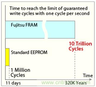 FRAM是一種兼具非揮發(fā)性與隨機(jī)存取功能的存儲器,能在沒有電源的情況下可儲存及高速寫入數(shù)據(jù)。值得注意的是,在眾多非揮發(fā)性內(nèi)存技術(shù)中,F(xiàn)RAM能保證一萬億次以上的寫入/擦除周期。富士通半導(dǎo)體自1999年開始量產(chǎn)FRAM產(chǎn)品以來,已將上述產(chǎn)品特性廣泛應(yīng)用在工廠自動化設(shè)備、測試儀器、金融終端機(jī)及醫(yī)療裝置等領(lǐng)域。