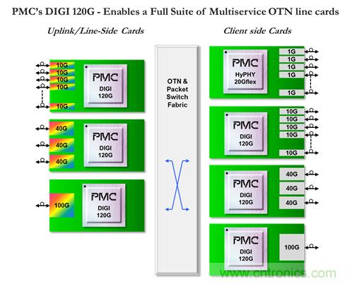 PMC的DIGI 120G是一款功能強大的100G OTN處理器,設(shè)計初衷是實現(xiàn)下一代光傳送網(wǎng)絡(luò)。DIGI 120G提供了高度靈活的平臺,使得OEM可以設(shè)計范圍廣泛的OTN解決方案,其中包括用于OTN交換的高密度線卡以及功能強大的用于P-OTN的混合OTN/分組線卡。DIGI 120G的獨特性在于: