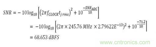現(xiàn)在,通過計(jì)算得到了所有必須的要素,但依然缺少最后一個(gè)公式。 需要計(jì)算此抖動(dòng)對(duì)AD9643的SNR產(chǎn)生的影響。 現(xiàn)在來看看這個(gè)公式是什么,然后代入已知數(shù)。已知時(shí)鐘頻率和rms抖動(dòng)。 從AD9643數(shù)據(jù)手冊(cè)中可以得到140 MHz模擬輸入頻率下的SNR等于71.4 dBFS。 使用公式,可以看到結(jié)果為: