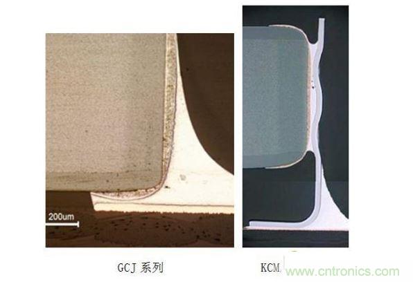 GCJ系列和KCM/KC3系列的構造圖如圖3所示。GCJ系列,其外部電極的基極電極和電鍍鎳/錫電極中間有一層樹脂電極。由于樹脂的彈性吸收了電路板的偏轉(zhuǎn)應力,并且,樹脂外部電極相對減弱了裂紋對陶瓷造成的破壞力,可以緩和電路板的偏轉(zhuǎn)應力。