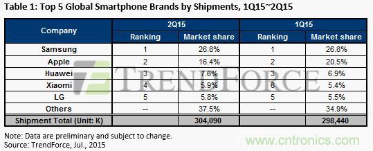 【導讀】近日,市場研究機構(gòu)TrendForce發(fā)布2015年度第二季度全球智能手機報告。中國的華為明顯獨領風騷。數(shù)據(jù)顯示,三星雖然從蘋果手里奪回第一的寶座,但是,Q1和Q2 幾乎毫無變化。蘋果的市場份額則一調(diào)再掉,從Q1的20.5%掉到Q2的15.4%。華為的市場份額增加了7%,小米的份額增加了5%。