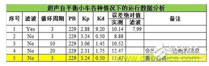 誤差絕對(duì)值是指小車在一段時(shí)間內(nèi),實(shí)測(cè)距離與設(shè)定平衡點(diǎn)距離誤差絕對(duì)值的平均值;濾波是指程序中對(duì)超聲波測(cè)量的距離濾波或不濾波直接使用;循環(huán)周期是程序中的延時(shí)時(shí)間,超聲波測(cè)量需要大約704us,一個(gè)周期大約為3.84ms,程序處理時(shí)間大約為136us.