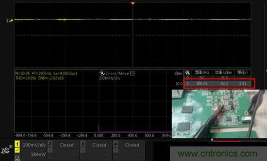 注:通道1信號(hào)幅度雖然非常小,但通過(guò)FFT分析還是可以定位出600K頻點(diǎn)的干擾。