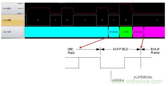 ACK界定符:ACK界定符是ACK場(chǎng)的第二個(gè)位,并且是一個(gè)必須為“隱性”的位。因此,應(yīng)答間隙(ACK SLOT)被兩個(gè)“隱性”的位所包圍,也就是CRC界定符(CRC DELIMITER)和ACK界定符(ACK DELIMITER)。