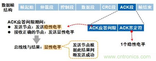 應(yīng)答間隙:所有接收到匹配CRC序列(CRC SEQUENCE)的節(jié)點(diǎn)會(huì)在應(yīng)答間隙(ACK SLOT)期間用一“顯性”的位寫入發(fā)送器的“隱性”位來(lái)作出回答,由于CAN總線線與的原理,只要總線上有一個(gè)節(jié)點(diǎn)正確接收到數(shù)據(jù),則ACK SLOT就會(huì)被填入顯性電平。