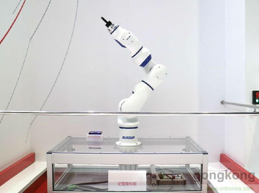 現(xiàn)場,內(nèi)置Gold Twitter的新松七軸協(xié)作機(jī)器人華麗亮相,動(dòng)作輕柔簡潔,控制柜體量小,線纜清晰明了。楊崇武先生介紹,在當(dāng)前的智能制造時(shí)代,設(shè)備越來越輕量化,埃莫的Gold Twitter系列可以放置在移動(dòng)荷載上、電機(jī)上或電機(jī)內(nèi),從而提高性能、節(jié)省空間,減少電纜和幾乎不需要電氣柜。
