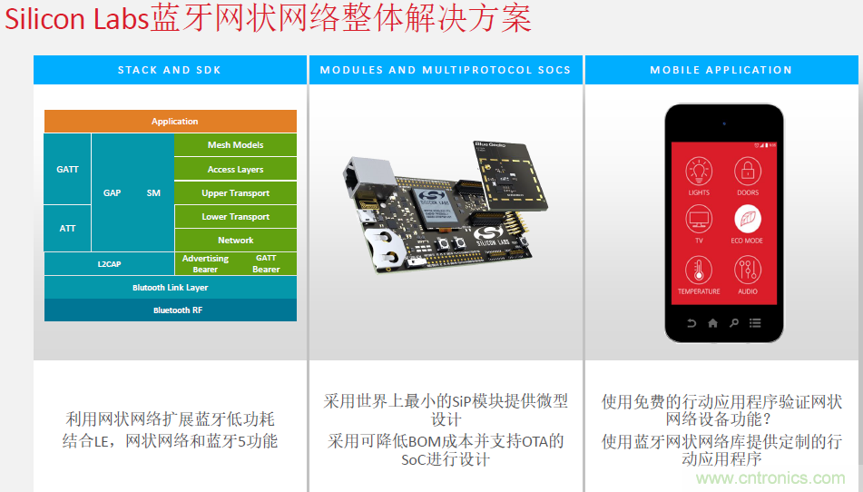 陳雄基以藍(lán)牙5的Mesh網(wǎng)絡(luò)和智能家居,尤其是智能照明中常用的ZigBee網(wǎng)絡(luò)為例,作了詳細(xì)的說明。就在一個多月前 Silicon Labs 為其Wireless Gecko片上系統(tǒng)(SoC)和模塊產(chǎn)品組合發(fā)布了新的動態(tài)多協(xié)議軟件,可同時在單一SoC上運(yùn)行zigbee和低功耗藍(lán)牙(Bluetooth low energy),匯集了這兩種協(xié)議的關(guān)鍵應(yīng)用優(yōu)勢。這種多協(xié)議解決方案可實(shí)現(xiàn)物聯(lián)網(wǎng)(IoT)應(yīng)用的高級功能,且不會帶來雙芯片架構(gòu)的額外復(fù)雜性和硬件成本,從而將無線子系統(tǒng)物料清單(BOM)成本和尺寸降低達(dá)40%。