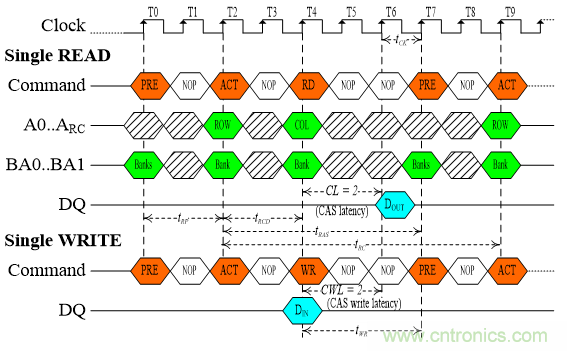 圖中,頻率時間(tCK)是從此次頻率邊緣至下次頻率邊緣為止的時間。列地址選通預充電時間(tRP)是從PRE命令至ACT命令為止的時間。列地址選通至行地址選通延遲(tRCD)是從ACT命令至RD命令或WR命令為止的時間。行地址選通潛伏(CL)是從RD命令開始等候一段時間,并且以tCK為基本單位,然后乘上倍數(shù)。寫入時間(tWR)是從WR命令至PRE命令為止的時間;另外還可以tCK為基本單位,然后乘上倍數(shù),如同行地址選通潛伏的計時方法,因此命名為行地址選通寫入潛伏(CWL)。列地址選通時間(tRAS)是從ACT命令至PRE命令為止的時間。更新命令時期(tRC)是從這次ACT命令至下次ACT命令為止的時間。