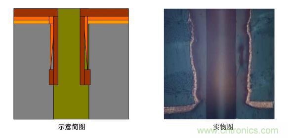 (2)孔內(nèi)板電銅薄孔無銅―――表銅板電層均勻正常,孔內(nèi)板電層從孔口至斷口處呈遞減拉尖趨勢(shì),且斷口處一般處于孔的中間部位,斷口處銅層左