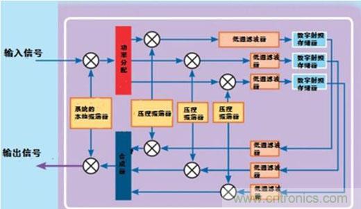 接著,修正的數(shù)字信號轉換為模擬射頻信號。通過使用與初始頻率轉換同樣的本地振蕩器,這個信號會被頻繁地轉換為接收頻率。降頻轉換和升頻轉換時,使用唯一的振蕩器保持了信號相位的相干性。