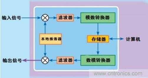 如下圖所示,數(shù)字射頻存儲器可以將接收信號轉換為中頻(IF)信號。然后將中頻信號的帶寬數(shù)字化。數(shù)字化信號被存儲在存儲器中傳輸?shù)接嬎銠C。計算機對信號進行必要的分析和修正,使其滿足干擾技術需求。