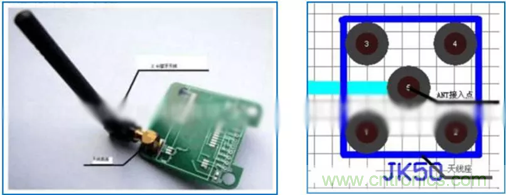 陶瓷天線是另外一種適合于藍(lán)牙裝置使用的小型化天線。陶瓷天線的種類(lèi)分為塊狀陶瓷天線和多層陶瓷天線。由于陶瓷本身介電常數(shù)較PCB電路板高,所以使用陶瓷天線能有效縮小天線尺寸,在介電損耗方面,陶瓷介質(zhì)也比PCB電路板的介電損失小,所以非常適合低耗電率的的藍(lán)牙模塊中使用。在 PCB設(shè)計(jì)時(shí),天線周?chē)獌艨站涂梢粤?,特別注意不能敷銅。如下圖: