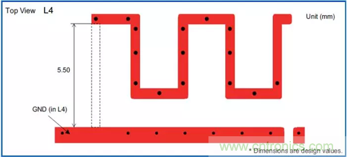 曲流型天線的長(zhǎng)度比較難確定。長(zhǎng)度一般比四分之一波長(zhǎng)稍長(zhǎng),其長(zhǎng)度由其幾何拓?fù)淇臻g及敷地區(qū)決定。曲流型天線一般是PCB封裝,即板載天線。和倒F型一樣,天線一般放置在PCB頂層,鋪地一般放在頂層并位于天線附近,但天線周?chē)鷦?wù)必不能放置地,周?chē)鷳?yīng)是凈空區(qū)。如圖2,圖3: