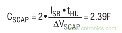 在后備模式中,當(dāng)超級電容器組上的電壓開始接近VOUT 時,在計算 tHU 結(jié)束時超級電容器上的最小電壓必須將兩個超級電容器的 ESR 和 LDO 的輸出電阻考慮在內(nèi)。假設(shè)每個超級電容器的 ESR 為 100mΩ,而 LDO 輸出電阻為 200mΩ,這將由于 50mA 待機(jī)電流的原因而使VOUT (MIN)增加20mV。VOUT (MIN)設(shè)定為3.1V,從而在超級電容器組上產(chǎn)生一個1.88V的放電電壓 (?VSCAP)?,F(xiàn)在,可以確定每個超級電容器的大小。