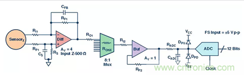 圖2. 差分放大器為數(shù)據(jù)采集信號鏈的第一級。