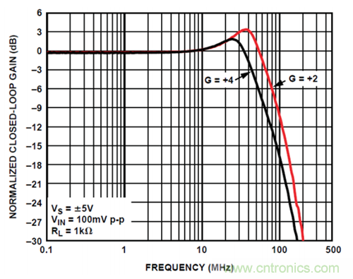 圖 1 所示增益可選放大器采用了一種創(chuàng)新的開關(guān)技術(shù),可以保持 ADA4896-2 的 1 nV/√Hz噪聲性能,同時(shí)降低非線性增益誤差。利用這種技術(shù),用戶可以選擇電容最小的開關(guān)來使電路的帶寬最大化。