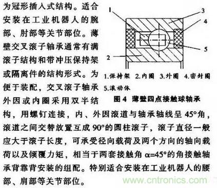 球軸承是機器人和機械手機構(gòu)中最常用的軸承。它能承受徑向和軸向載荷,摩擦較小。其機器人專用軸承四點接觸式設(shè)計以及高精度加工。這種軸承比同等軸徑的常規(guī)中系列四點接觸軸承輕25倍。它的內(nèi)圈(或外圈)由兩個半圈精確拼配而成,而其整體外圍(或內(nèi)圈) 的溝曲率半徑較小,使鋼球與內(nèi)、外圈在四個“點”上接觸。既加大了徑向負荷能力,又能以緊湊的尺寸承受很的兩個方向的軸向負荷,并且有很好的兩個方向的軸向限位能力,因為它的軸向游隙相對較小。而其接觸角 (一般取為35)又較大。工業(yè)機器人專用薄壁四點接觸球軸承通常有帶密封圈和不帶密封圈的結(jié)構(gòu)形式(見圖4)。其主要由內(nèi)圈、外 圍、保持架、鋼球或非接觸式密封圈組成。內(nèi)、外圈均為整體結(jié)構(gòu)。鋼球與內(nèi)、外因溝道呈四點接觸.保持架為冠形插入式結(jié)構(gòu)。