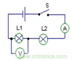 如圖所示,我們可以把電路圖分為兩部分:“和電壓表并聯部分”即L1和“并聯以外部分”——L2、電流表、開關。