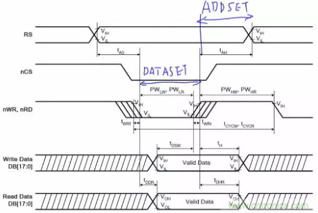 而ADDSET指的是地址建立時間,指的是片選之后到讀/寫操作之前的時間,這是針對SRAM來說的,如果操縱的是TFT,不存在地址線,所以此時的ADDSET就是讀/寫信號結束到RS電平的轉(zhuǎn)換時間。