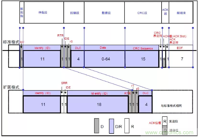 47、CAN協(xié)議的有5種類型的幀:數(shù)據(jù)幀、遙控幀、錯誤幀、過載幀、幀間隔。其中前兩種幀有標準格式(11位ID)和擴展格式(29位ID)。