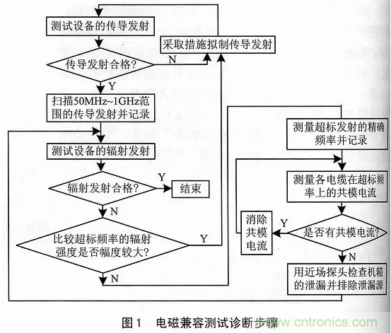 圖1給出了一個(gè)設(shè)備或系統(tǒng)的電磁干擾發(fā)射與故障分析步驟。按照這個(gè)步驟進(jìn)行,可以提高測(cè)試診斷的效率。