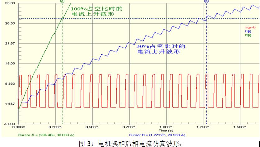 由于在低速大負(fù)載運(yùn)行時(shí),電機(jī)的旋轉(zhuǎn)反電勢(shì)很小,為了使電機(jī)的相電流不超過允許的最大值,PWM占空比通常比較小,這使得換相后新的相繞組電流上升緩慢。圖3中是電機(jī)換相時(shí)的電流仿真波形。電機(jī)兩相之間的電感為Lm=0.4mH,內(nèi)阻Rm=0.28歐姆(實(shí)際電機(jī)的參數(shù))。采用AOS(萬代半導(dǎo)體)生產(chǎn)的AOT460 MOSFET進(jìn)行仿真。MOSFET的PSPICE模型采用level3等級(jí)。由圖3中可以看出,如果PWM占空比為30%,則電流由零上升到30A需要約1.3ms。這與圖2a中實(shí)測的波形相仿。為了使換相后電流迅速上升,我們可以使換相后PWM占空比為100%來對(duì)電流進(jìn)行補(bǔ)償,直到電流上升到換相前的電流值,這樣可以使換相電流的波動(dòng)盡可能的小,時(shí)間盡可能地短。由仿真波形中I2可以看出,電流上升到30A的時(shí)間小于300us。