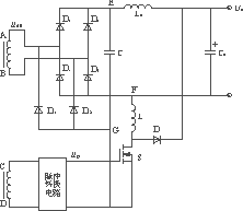 二次為橋式整流電路如圖4所示。圖中D1,D2,D3,D4為主整流管;D11及D12為毛刺吸收電路專用二極管。Lo與Co為主整流電路中的電感和電容;C為毛刺能量儲存電容。L,S,D組成毛刺能量轉換釋放電路。主變壓器中繞組CD和脈沖轉換電路一起形成S的開關控制脈沖ugs,與繞組AB形成固定的相位關系。繞組AB的電壓uAB波形與S上的驅動脈沖波形示于圖5。