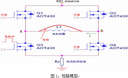 短路模型如圖1所示,其中僅畫出了功率輸出級的A、B兩相(共三相)。Q1和Q3為A相MOSFET,Q2和Q4為B相MOSFET,所有功率MOSFET均為AOT430。L1為電機(jī)線圈,Rs為電流檢測電阻。