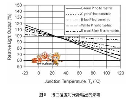 散熱設(shè)計(jì)是LED光源區(qū)別于傳統(tǒng)光源的課題之一。傳統(tǒng)燈具產(chǎn)生的熱遠(yuǎn)高于LED,但傳統(tǒng)燈具不會(huì)因?yàn)楦邷囟档推涔庠摧敵瞿芰?,但LED的光輸出卻會(huì)隨著本身接口(Junction, PN接口)溫度的升高而下降,如圖8所示。而其產(chǎn)生的熱如何散除到外界環(huán)境與其封裝結(jié)構(gòu)材料息息相關(guān),牽涉到使用的散熱材料與相關(guān)外型,關(guān)系如圖9所示,其中熱阻的概念,代表輸入W功率時(shí),需要提高多少K溫度才足以散熱。以現(xiàn)有的封裝技術(shù)最高可允許LED操作在185℃(Lumiled?。耍玻?,但一般因?yàn)榉庋b膠材的關(guān)系,可允許的操作溫度約在125℃,除了考慮光源輸出效率之外,亦考慮封裝膠材的變質(zhì)(樹(shù)脂類材料在高溫有老化現(xiàn)象)。