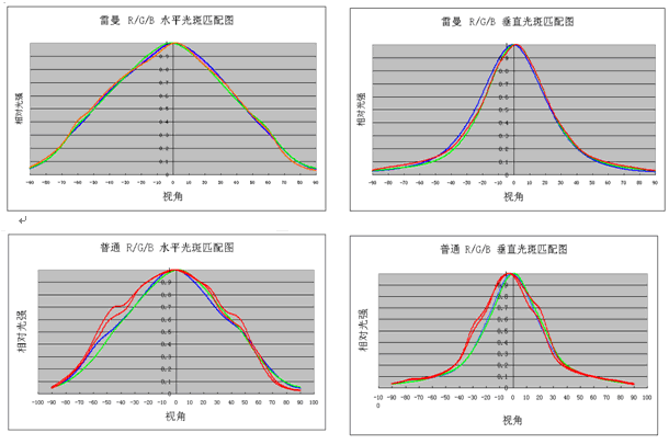前兩幅圖是雷曼光電自行研制產(chǎn)品的配光效果,后兩幅是以前用公模的產(chǎn)品的配光效果,從圖中可以看出,原來公模的產(chǎn)品在50度角度左右可能會偏紅,要調(diào)整到比較理想的效果比較困難。雷曼光電自行研制的產(chǎn)品考慮到了客戶的這種需求,在左右90度的三種顏色的配光都較為理想,這就為顯示屏的白平衡調(diào)節(jié)提供了強(qiáng)有力的支持。