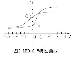 鑒于LED 的芯片有9×9mil (250×250um),10×10mil,11×11mil (280×280um),12×12mil (300×300um),故pn 結面積大小不一,使其結電容(零偏壓)C≈n+pf左右。C-V 特性呈二次函數(shù)關系(如圖2)。由1MHZ 交流信號用C-V 特性測試儀測得。