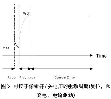 PMOLED彩色顯示要求的驅(qū)動(dòng)機(jī)理和信號(hào)互換系統(tǒng)非常復(fù)雜。SSD1338的驅(qū)動(dòng)器采用復(fù)用的尋址算法,每個(gè)驅(qū)動(dòng)周期由放電(復(fù)位),電壓預(yù)充電和電流驅(qū)動(dòng)三個(gè)階段組成(如圖3所示)。